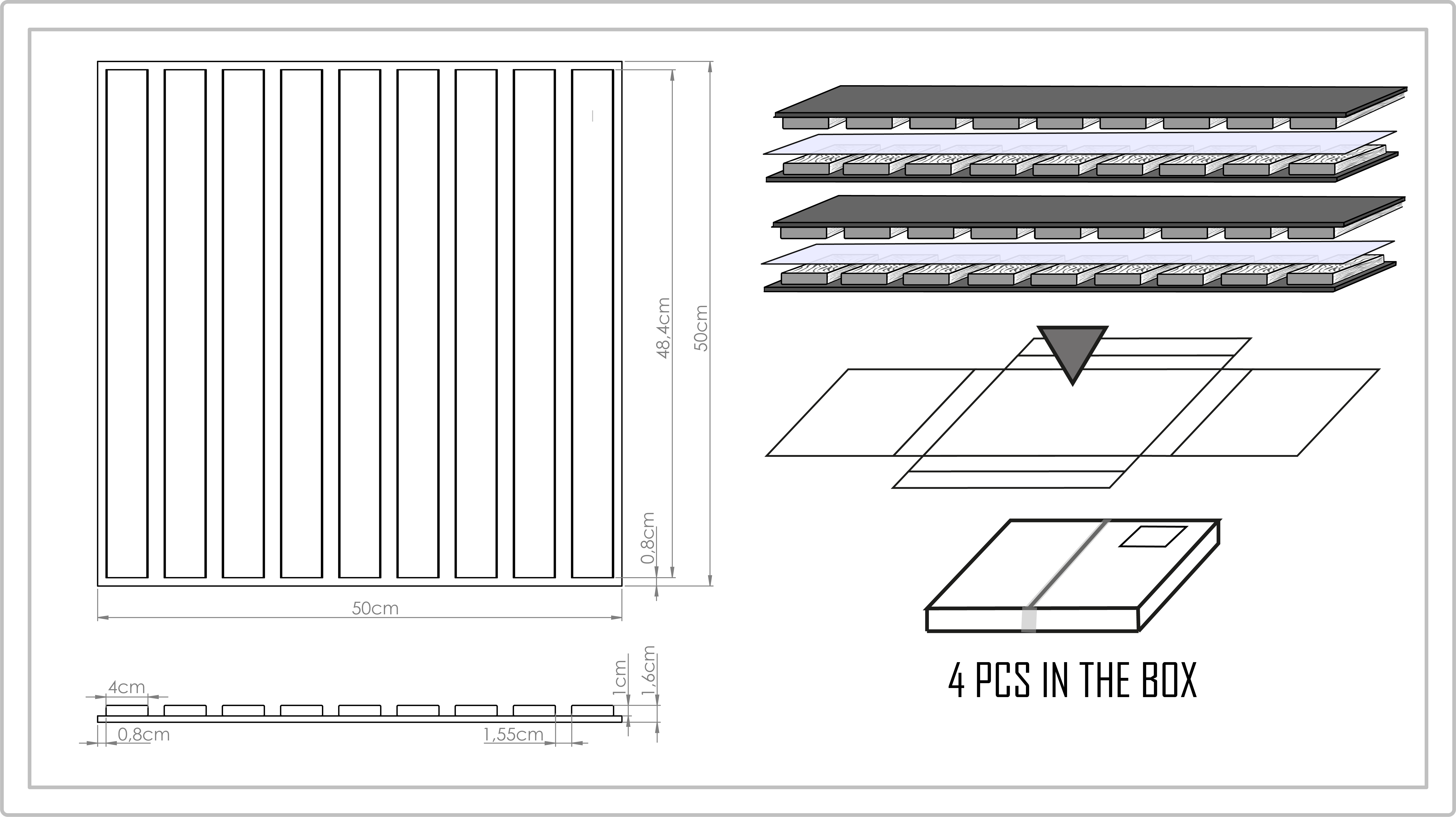 PRAKTYCZNY FORMAT 50x50 cm – Zestaw zawiera cztery panele o wymiarach 50 x 50 cm, które można elastycznie łączyć, tworząc dekoracyjne ściany akcentowe lub indywidualne aranżacje ścienne.